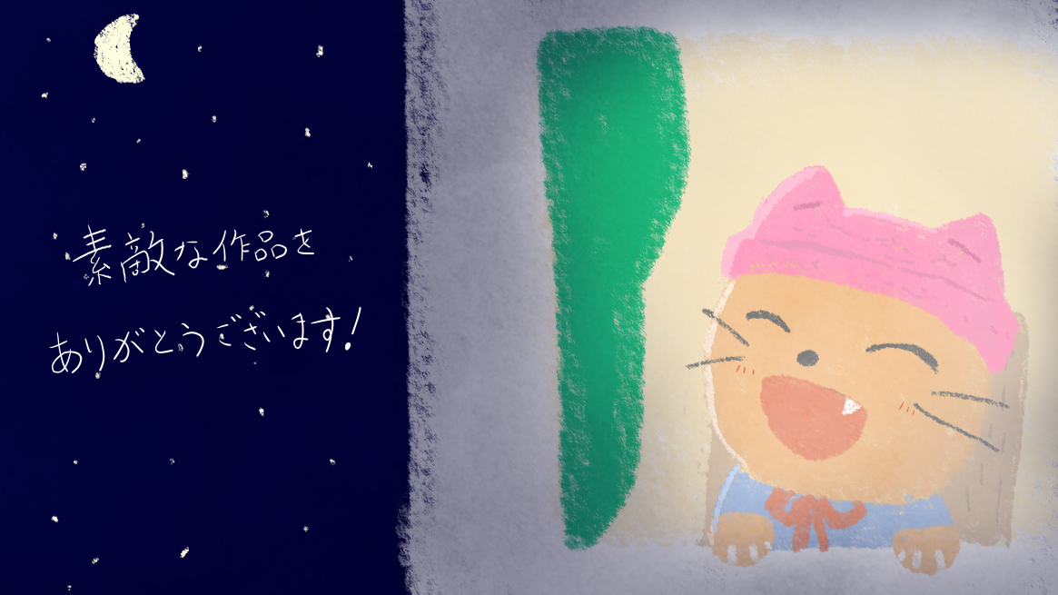 すご~いえら~いてんさ~い ヒーリングねこちゃんコロニャーンゆるーいイラストと雰囲気にとても癒されました。 そして、コロニャーンの絵も声も、とっても可愛い! 足裏のハート型の肉球が、凄くキュートで好きです。 優しく褒めてもらえるのが嬉しくて、とても元気をもらえました。 @ネタバレ開始 おしまいの"今日も一日お疲れ様でした"の文字とオルゴールの音色が、胸にじんときました。 褒め言葉が持つ温かい魔法をかけてもらえて、少しだけ心が軽くなった気がします。 日常の中にある頑張りを、自分でもちゃんと褒めてあげたいと思いました。 @ネタバレ終了 ほっと一息できる、温かい時間を過ごすことができました。 素敵な作品をありがとうございました! -