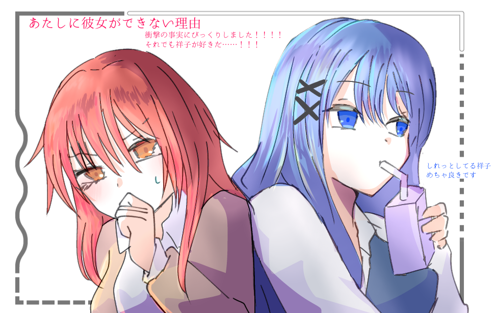 【百合サウンドノベル】あたしに彼女ができない理由プレイしました!!! フェスでお見かけしてから気になっていた作品でした! @ネタバレ開始 冒頭のモノローグからすでに面白すぎて笑いながら読み進めました笑 下心を隠す気が微塵もないのが逆に好感度高いです、素敵 祥子のことは「何だかんだ話に付き合ってくれる面倒見のいい子」という第一印象でした。だからこそラストで明かされる事実の衝撃さがすごかったです……!!!うそ〜〜!?!!? 思わず声に出してしまいました……祥子……それでも好きだ私は…… 祥子、清楚な見た目に反して手慣れているのあまりにも刺さりすぎて困りました、好きだ祥子…… 追記 FAに主人公ちゃんの髪飾り、描いておりませんでした……!すみません……!!! @ネタバレ終了 ヒロインどちらも魅力的でやり取りが可愛い面白かったです! -