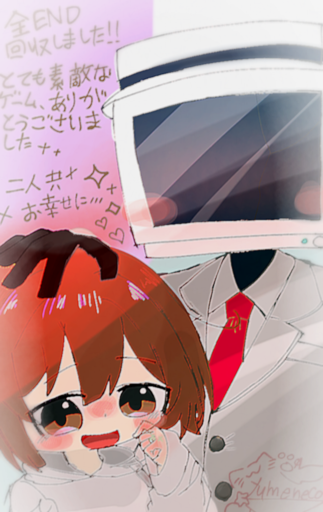 ストーカー人外に誘拐されましたゲーム実況で知り、自分でプレイしてみました! @ネタバレ開始 セルモニが私の好み過ぎて最高です!✨ 元々人外系は好きですが、このゲームのセルモニと主人公の関係が変わっていくのが好きで終始ニヤついてて、更に人外にハマりそうです✨ 最後に幸せなENDを見たかったので、END4→3→2→1の順で回収しました。 4の白衣を着たセルモニ最高すぎます!✨ セルモニが豹変して愛も忘れて主人公に今まで言わなかったことを言うけど、主人公はその様子を見て「本性を現した」って言ってて、心が壊れる前のセルモニが可哀想で「セルモニ...😢」ってなったけど、ダークなカッコよさのセルモニに私はニヤついてたと思います✨ 白衣が赤くなってて主人公はニンゲンの形をしてなかったそうでビックリしましたが、最後に別のニンゲンの名前を聞いたことでセルモニは本当に主人公の命もニンゲンのことも実験以外どうでもよくなってしまったんだなって...。 END3は、回収が難しく何回も4ENDに行ってしまったのですが、無事洗脳ENDを見ることが出来ました✨ いつも敬語なのにその時に「私を見ろ」と命令口調になってて、1、2と違って愛してはいるけど歪んでいる感じが最高で個人的に凄く好きなENDです! 2ENDではセルモニが愛している人に「忘れてください」と言える勇気が凄いと思いました!✨ お互いのことを一途に愛してるからこそ、セルモニも主人公もとても切なくて悲しい別れになってて、この時間軸の2人もどこかで再会してて欲しいなと思いました✨ 主人公は思い出しか持ち帰れなかったけど、セルモニは主人公の生活の痕跡とプレゼントした指輪を今も大切に持ってそうです✨ END1のセルモニは「以前の自分は洗脳してたかも知れないけど、主人公が素晴らしい人だからそんなこと出来ない」って言ってたり、主人公も大切な自分の名前を教えてて、心からの本音を話せる程仲良しになっててほっこりしました✨ 指輪を託して名前を教えてもらったことでセルモニも住み慣れた世界を捨てて主人公と暮らす決心がついたのかなって🥰✨ 1、2でセルモニの顔をあえて描かないことで、セルモニと主人公の2人だけの秘密って感じがして好きです!🥰✨ 仲良しで信頼してて本音を話せる1、2軸はプレゼントは指輪だったけど最終的に実験されたり洗脳されたりする3、4はネックレスでセルモニにそんな意志はないけど、首輪っぽくて好きです!✨🥰 1、2軸の主人公は魔物から守ってくれて本気で心配して感謝してたけど3、4軸は守ってくれて恩があるハズのセルモニを憎んで、話も聞かないで信頼しなくなるの悲しすぎて心にきました...。 3、4のセルモニ本当にごめん...、どうしても全部ENDを回収したかったんだ...。 クリア後にEND1のファンアートを描いたので、良ければ見てみて下さい!✨@ネタバレ終了 本当に素敵なゲームを、ありがとうございました!✨ どのENDにも良さがあって最高です!✨ 追記 ファンアートに塗り忘れがあったので、修正して再投稿しました。 すみませんでした🙇 -