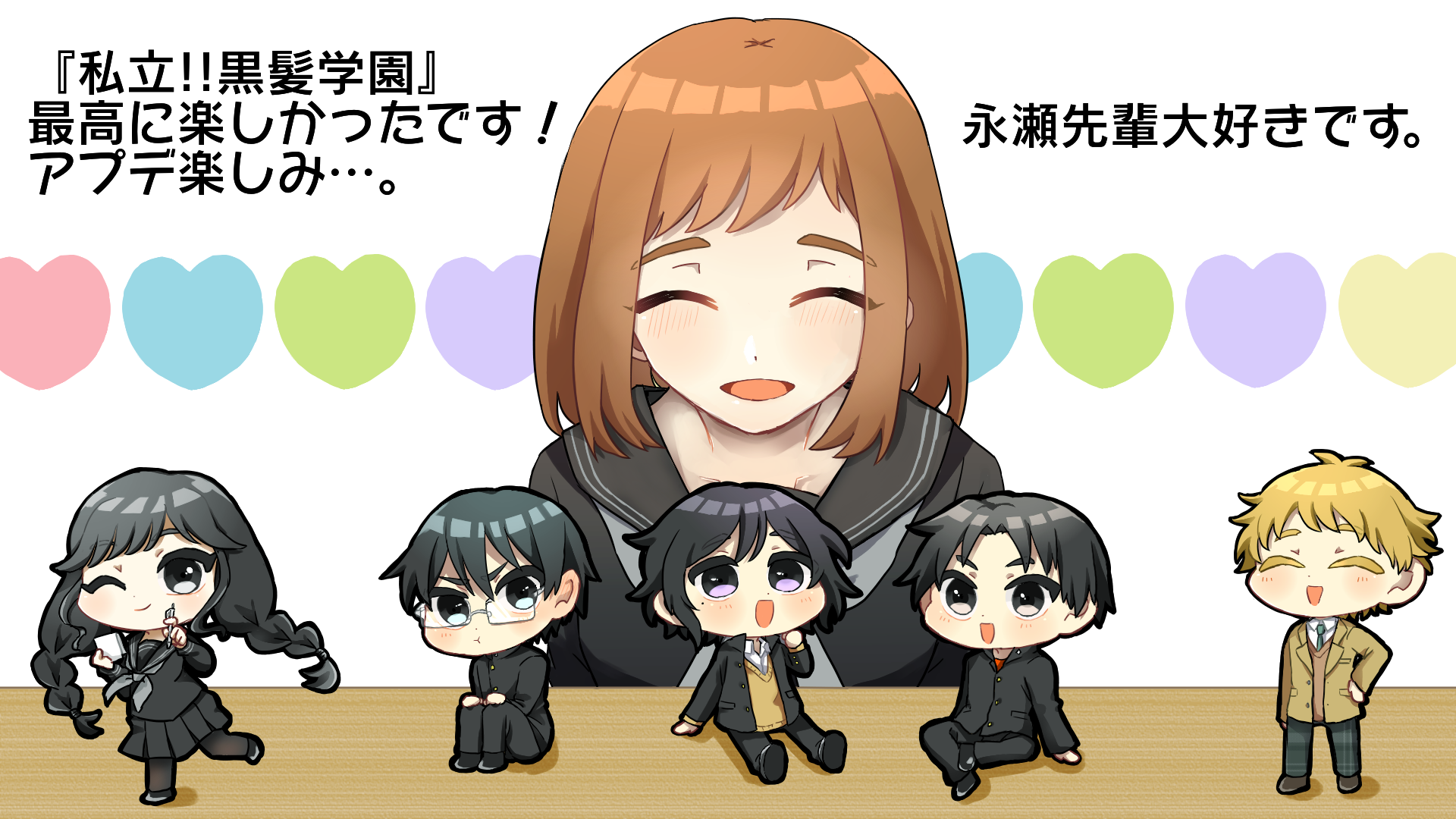 私立!!黒髪学園【10/19追加DLC公開】軽く遊べる乙女ゲームがないか探していたところ、こちらのゲームと出会いました。 イラストやがキャラクターデザインが好みでプレイしてみたのですが、かなり作り込まれた設定やしっかりした世界観やストーリーで、気付けばすぐに引き込まれてしまいました。 軽くプレイするどころか面白すぎてガッツリ全エンディングコンプしてしまいました!どのルートも本っ当に良かったです。 キャラクターもストーリーも好みで本当に素晴らしい作品でした…!! サブキャラクターたちも全員魅力的でしたし、どのルートもそれぞれのキャラクターの良さが出ていて大変良かったです。 全員大好きですが、個人的に1番見た目も中身もストーリーも全て含めて永瀬先輩が大好きです。 アプデで攻略対象キャラや3人の後日談等も追加して下さるということで楽しみにお待ちしております!! これからも応援しております!! -