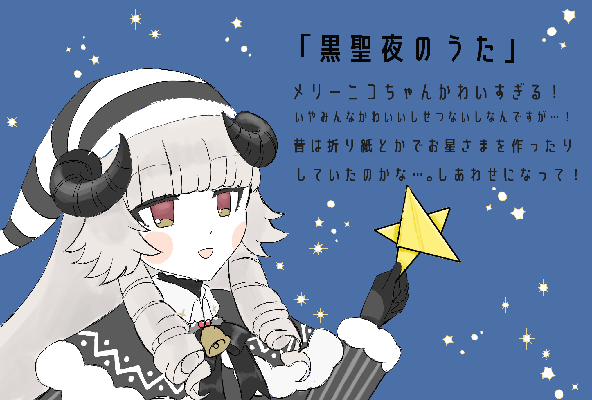 黒聖夜のうた素敵な作品をありがとうございました!制作お疲れ様です! おにロリは…いいぞ…!!! @ネタバレ開始 おにロリ!おにロリ!!かわいいヤッターーー!!! 私はこんなかわいいおにロリが大好きでして…。えっ本当にかわいいね??? 主要キャラ皆かわいいし切ないしそれぞれの言動が考えさせられるような物語で私の情緒はもう滅茶苦茶ですよ!ありがとうございます!!! それぞれの過去の逃げたい変えたいと思っていってもどうにもならなかった状況だったころの傷を思うと、今はささやかながらも幸せに暮らしてくれているのがもう涙が出るほどよかったね…!これからも幸せに生きてね!となっております。 今回は主にメリーニコちゃんとクララウスさんに焦点を当てた物語ではありましたが、クロヒトさんはもちろん、トルエルさんもなにかあったんだろうな…。と思わせられる言動だったので…。それでも懸命に生きてくれていてありがとう…。えらすぎる…。 エンド分岐はノベルゲームコレクションのゲーム紹介画像にヒントが滅茶苦茶ありましたね!そのおかげかゲーム中のヒントなしでも割とすぐに察せられることはできましたが、たぶんそっちがトゥルーエンドかな?と思ったのでノーマルから回収させていただきました。これはこれで好きエンドです!皆で楽しい時間を過ごして欲しい!きっと過ごせたと信じています! そしてハッピーエンド、ハッピーエンドというか二人の過去が明確にわかるという感じでしたね。クララウスさんの救いにメリーニコちゃんがなれたと同時に、メリーニコちゃんの救いもまたクララウス先輩だったと考えると尊すぎて泣きます。私が。 以下各メインキャラクターへの感想 メリーニコちゃん かわいい~~~!!!お仕事衣装もかわいすぎてブラックサンタという職業よありがとうありがとう…。 ご両親もメリーニコちゃんを愛していないわけではなかったんでしょうけれど、過去回想を見ている方もつらくてそりゃあ逃げ出しますよね…。逃げ出した先でつかんだものを大切にして、でも過去自分がしようとしてしまったことも忘れないようにして前に進もうとしているのえらい!先輩大好きでかわいいね! クララウスさん メリーニコちゃんに対して出る柔らかく言い聞かせるような言動がかわいすぎまして…そしておまけで覚悟完了していると知れたことがまた尊すぎて…ですね…。 クララウスさん、ブラックサンタの仕事の教え方も丁寧だし物腰も柔らかいしで、きっと世間一般的には優秀だったんだと思うんですが、環境が悪すぎて劣等感とかでネガティブ思考になってしまっている感がすごくて…。 押しに弱いと思うので自覚がないまま徐々に己の生活圏に入り込んだメリーニコちゃんに外堀を埋められていそうな気がします! クロヒトさん 物語の文字通りカギとなるキャラでしたね…。思わず雪だるま作っちゃうのかわいい。彼も絶対に過去が重い…。彼もまた色々な苦しさを抱えながらも前進していける強さのある人だと思いました。 トルエルさん セリフが深いかつずっしりと重たい…!実はおまけを見るまではサンタって勝手に長寿だったりするのかな?と思っていたのですが、なんと15歳…15歳!?そんな深いセリフを言える15歳って何!?将来よき女王様になれる風格が既にあります…! -