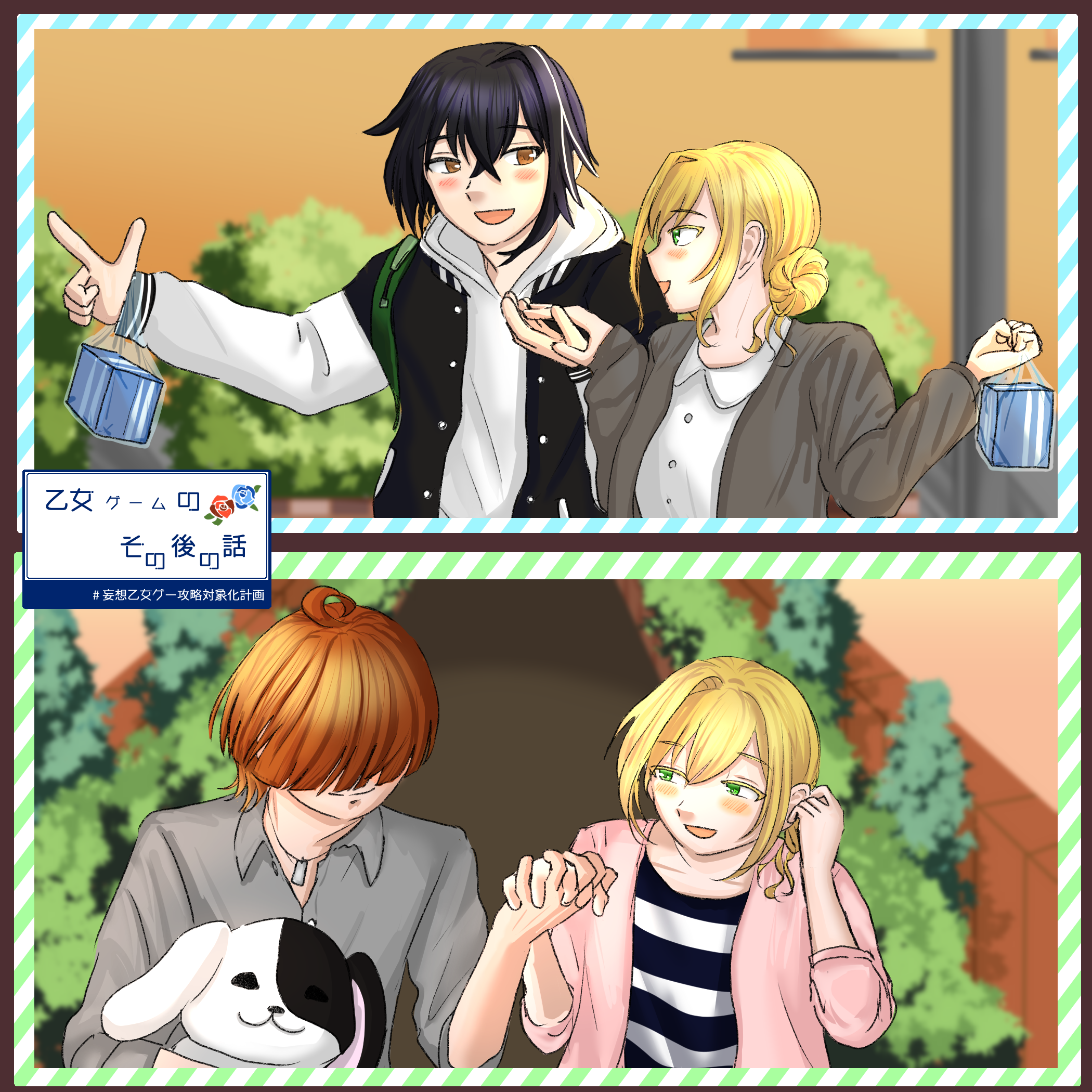 乙女ゲームのその後の話とても、心があたたまるゲームでした。 全体的に、本当に真心が込められているんだな、と感じました。 作りこみがすごいです……! いろいろな夢想高校の生徒やほかの作品のゲームが登場して、すきです! 恋斗くん、すがりくん両方のお話が見られて本当に幸せです!(*^^)v 最初のお話のあらすじも、プレイヤーに優しい! と思いました。 あとアイキャッチが本当にかわいいです!!本当にかわいい!癒しです。 そしてボイスと声優さん! 恋斗くんの声もすがりくんの声も「ピッタリ」と思いました!! @ネタバレ開始 各キャラをプレイした後のスチルが本当に本当にかわいくって、見とれてしまいました。。 すがりくんルート ・お互いに遠慮なし、という言葉が二人の間で再定義されていったのがすごくいいな、と思いました。二人でないと、この再定義はできなかっただろうな~……と思いました。 ・すがりくんの声、好きなのですが特に好きなのは「多分ね」なんですよね……!!! 聞いた瞬間好きでした!!!!! >映画館 イオンちゃんに手を添えるすがりくんも照れるイオンちゃんも大好き~です! 本当に本当に、映画館の映画の内容を選べるのがすごすぎて、圧倒されました。愛が溢れている、、、! すがりくんにたくさん服を選んでるイオンちゃん可愛い~ 最後の電車のスチル、良すぎます。。あったかい。。安心するふたり、良すぎる~ >遊園地 洋食屋さんでのお話、良い~。すがりくんが「得意なこと」を言えているのがいいなあ、と思いました。 イオンちゃんのコスプレ、かわっっ!!! 好き!!です。 注意しあえる関係、よいなあ、と思いました。。 恋斗くんルート 初めのスチル、マジで好きです。。イオンちゃんの右手、恋斗くんの横顔、桜、良き、、ハーモニーを奏でている。 >>破壊力がやばいなって、思ってました…。 う~好きです!この二人の空気感かわいい、、愛らしい、、、です! イオンちゃんのママパパも見られるの、すごくいいですね、、 ずっと手をつないでくれたら機嫌治る!? かわいすぎます。恋斗くんとともに悶絶しました。 恋斗くんのボイス、全部好きですがもっとも好きなのは「やめてね」ですね、、この絶妙な感情の「やめてね」、、う~ん良い!好きです! >水族館 ・あのときはありがとうね? って言ってどういたしまして? って返しあう関係性好きすぎ~ます! ・アイスのスチル、本当に可愛いです。幸せがいっぱい。そして背景が美しいです。 夢の話、いいなぁ、愛を感じます。 >>「案外、知らないのも悪い事じゃないのかなって。」 こういう風に世界を認識しているんだなあ、と知られてよかったです。 マフィン、また、作ってほしい&食べてほしいですね、ぜひ。 >遊園地 好きな服装の話、良いなあ、、テンション上がっているイオンちゃんかわいい、、 がおー、めっちゃ可愛い~~!!!! 庭園での恋斗くん、ああ、トレアさんがこのゲームを作ってくれて、よかったなあ、としみじみと感じました。 膝枕、お互いに、、労わりあっていて素敵です。。 >温水プール くぅ! このルートは脳内で想像するしかないですね、、!! 最後のお父さんとのスチル、好きです。恋斗くんの17歳らしさをとくに感じるというか、、! すがりくんも恋斗くんもイオンちゃんも、それぞれの気持ちというものを確かにしていけてよかったなあ、と思いました。 ファンアートは、各ルートの最後の方を妄想して描かせていただきました!! 恋斗くんはふたりでアイス買って、一緒に小走りで帰ってそうだな!と……! すがりくんは、ふたりで手をつないで帰ってそうだなあ、と思い、描きました! はじめは独立した2枚だったのですが、「組み合わせて1枚の絵にできる!?」と思い、1枚の絵にしました!! すごく温かいゲームでした。本当に……。 @ネタバレ終了 プレイできてよかったです、素敵な作品をありがとうございました。 -