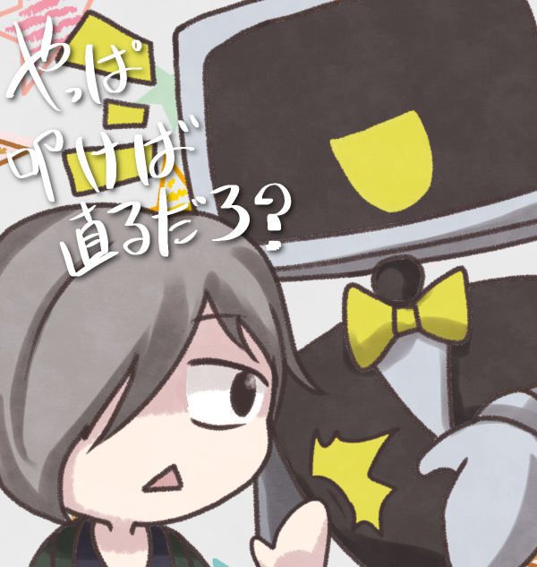 やっぱ叩けば直るだろ?とても楽しい二人の掛け合いを見させていただきました(*´ω`) @ネタバレ開始 さり気なくダメージ部分も帽子になってたりと伏線があってすごいなあと思いました! 電化製品だから叩く…というより昔からの(コンビ時代の)感覚で叩いているのかなあとかも思ったり(?) 最後(エンド2)は帽子選び終わったら二人でラーメンでも食いに行ってほしいな~~~~~~~~って思ったけどBKは食えないか… ともかく二人に幸多からんことを祈ってるわ!! -