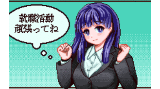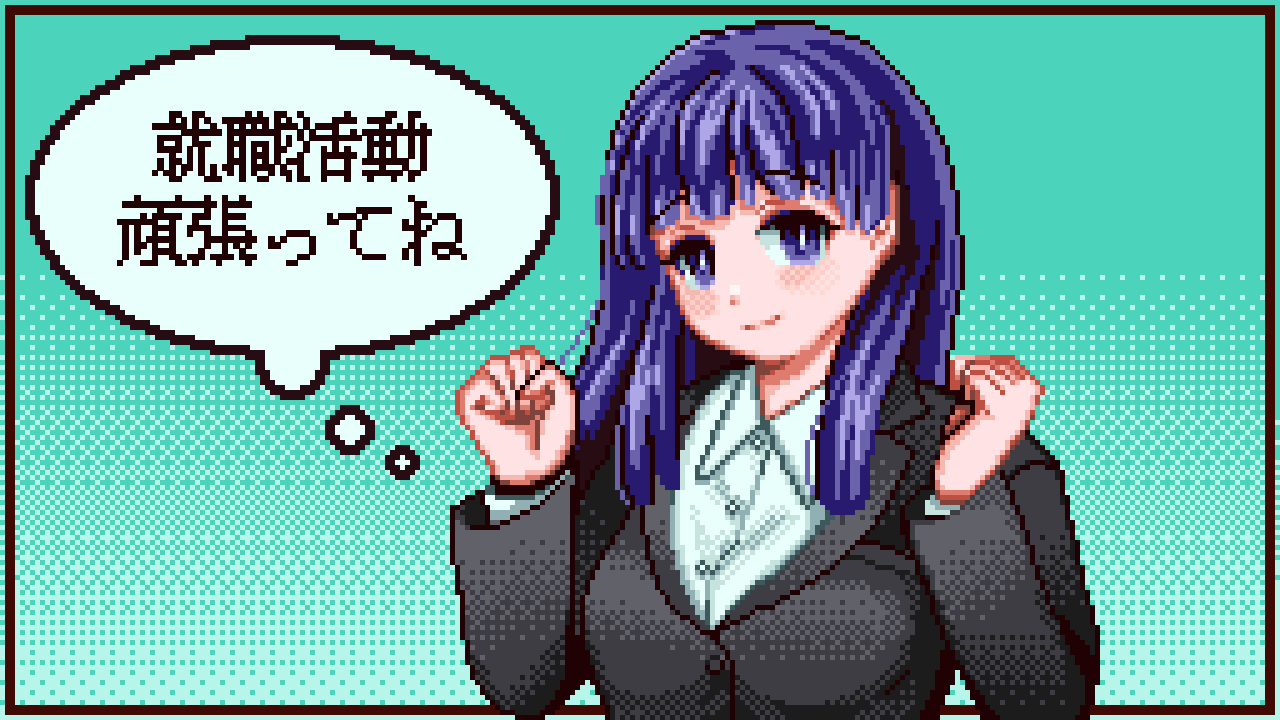 シューカツ! ~forever with 御社~就職活動をゲームにしてしまうという斬新なアイデアと、プレイすればするほど強くなり戦略性も増すというシステムが非常におもしろかったです。 何周も夢中になってプレイしてしまいました。 @ネタバレ開始 レトロゲームっぽいUIやシステムを踏襲しつつもかなり遊びやすい作りになっていて、周回プレイ前提でもほとんどストレスなく楽しくプレイできました。 DIGITALLさんのレトロ風ゲー作品に登場するヒロインは毎回可愛いなあと思っているのですが、今回の星乃さんは個人的にすごく好みで「星乃さんとお近づきになりたい!」という下心も相まって周回プレイのモチベーションがずっと高いままでした。 基本的には面接で話すエピソードカードを集めながらうまく使って面接を突破していくというゲームですが、カードのレア度や強さの数字が大きければいい、というわけではなく面接官のキャラクターによって有効な手札が違うので「ゲームバランスがよく練られているなあ」と感じました。 また、そのエピソードカードに付随するエピソードがやたらリアルでおもしろかったです。 ちょっとしたエピソードを盛ったりネットで見た話を自分のエピソードとして語ったりするの、就活あるあるだよな~とちょっと懐かしくなりました。 フリーランニング大学などの大学名や何だか既視感のある人事部長や女社長など、メタ的なネタもちょうどいい塩梅でおもしろかったです。 個人的にイーロン! な会社を見てきた男性に見初められるエンドがぶっ飛んでて好みでした。 そして、「星乃さんと親密になりたい」という個人的欲求で進めてきたゲームですが、まさか星乃さんにそんな能力があったとは……。 いや、冒頭から「直接脳内に語りかけてくる! もしかして能力者か!?」と冗談まじりに思ってはいたのですが、本当にそうだとは思いもしませんでした。 ラストも星乃さんのキャラクター性を生かしたもので、良かったです。 ただ、自分があまりにも星乃さんに入れ込みすぎていたために「え!? 終わり!? 続きは!?」と思ってしまいましたが……。 そういうわけで(?)ファンアートを描きました。星乃さん、才色兼備で素敵です。 @ネタバレ終了 すべてがハイクオリティで大満足な作品でした! 素敵な作品をありがとうございました! -