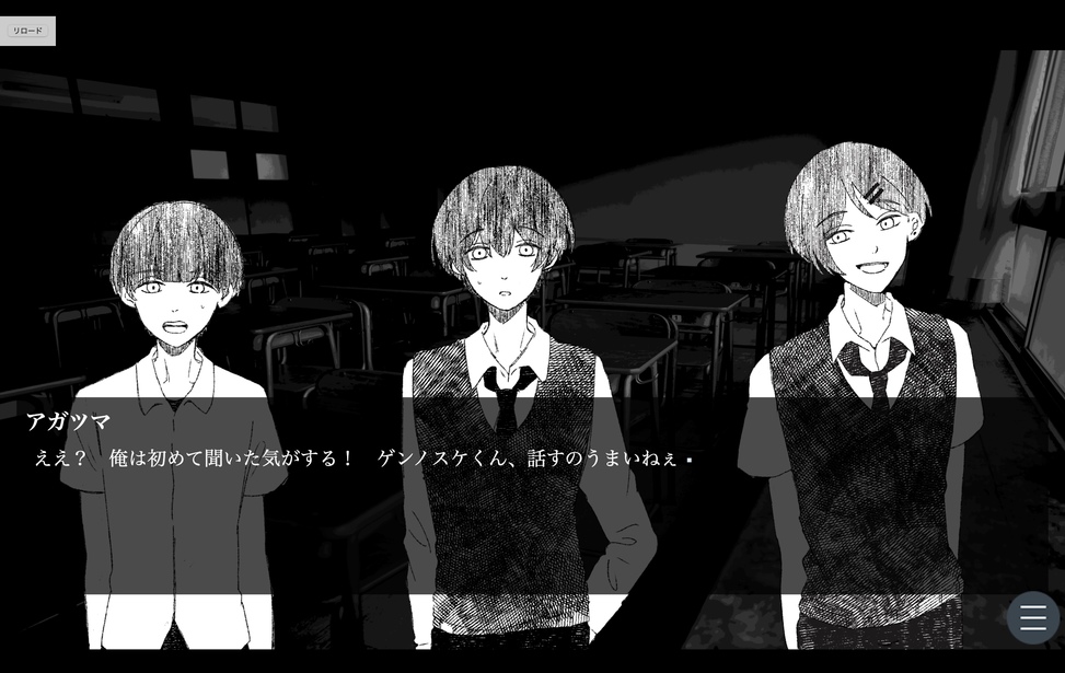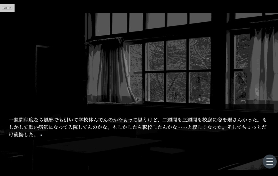 怪談サークル(仮) web Language English中文(简体)中文(繁體)한국어РусскийDeutschFrançaisEspañolPortuguês日本語 プレイ時間:1時間 【お知らせ】 本作品は最後まで遊ぶことができますが、ブラッシュアップ期間(10月)に複数回修正を行う予定です。念のため実況プレイは11月までご遠慮いただけますと幸いです。 完全版までもう少々お待ちください! 【内容】 とある高校で、深夜に集まった男子高校生たちが怪談話をするノベルホラーゲームです。 エンディングは二種類。終盤の選択肢で分岐します。 ──俺たち、どうしてこんなことをしているんだっけ。 すべて表示折りたたむ ティラノフェス10参加作品 ゲーム実況NG ホラー 高校生 コインで作品を応援する ブラウザでプレイゲームをプレイする windowsPC(Windows)版をDL starempty評価 star star star star star heartempty追加 twitter共有 コメント 応援コメント・ファンアートを気軽に投稿しよう! 投稿するには、ノベルゲームコレクションへの参加が必要です。 ノベルゲームコレクションへ参加する もっと見る