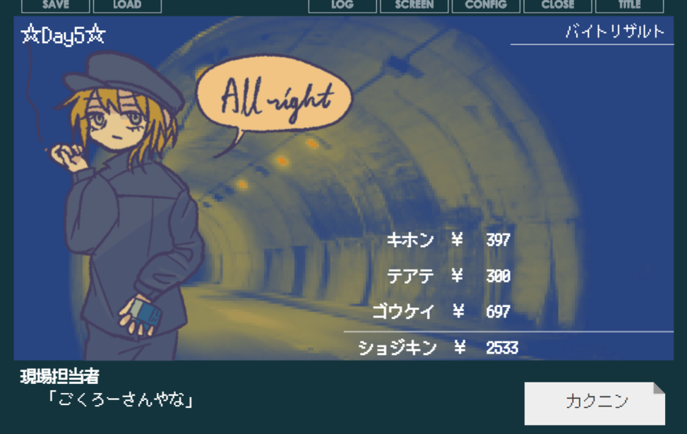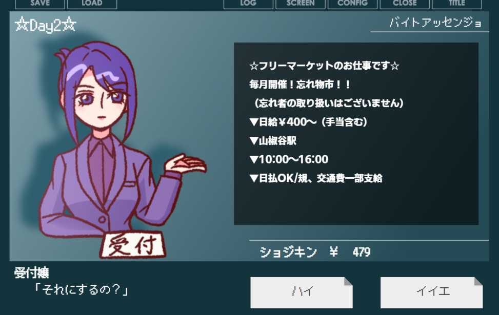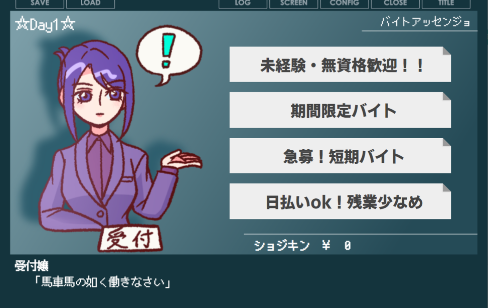 ブラック オア ノットブラック web Language English中文(简体)中文(繁體)한국어РусскийDeutschFrançaisEspañolPortuguês日本語 プレイ時間:15分 ひょんなことからバイトを探すことになったあなた。 ところが、提示される求人は怪しいものばかり……? なんとか一週間耐えてください。 ※この作品は10月中にブラッシュアップ予定です すべて表示折りたたむ ティラノフェス10参加作品 ゲーム実況OK 短編 コインで作品を応援する アップデート対応中 このゲームは、一時的にゲームの配信を停止しています starempty評価 star star star star star heartempty追加 twitter共有 コメント 応援コメント・ファンアートを気軽に投稿しよう! 投稿するには、ノベルゲームコレクションへの参加が必要です。 ノベルゲームコレクションへ参加する もっと見る