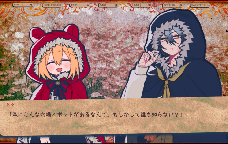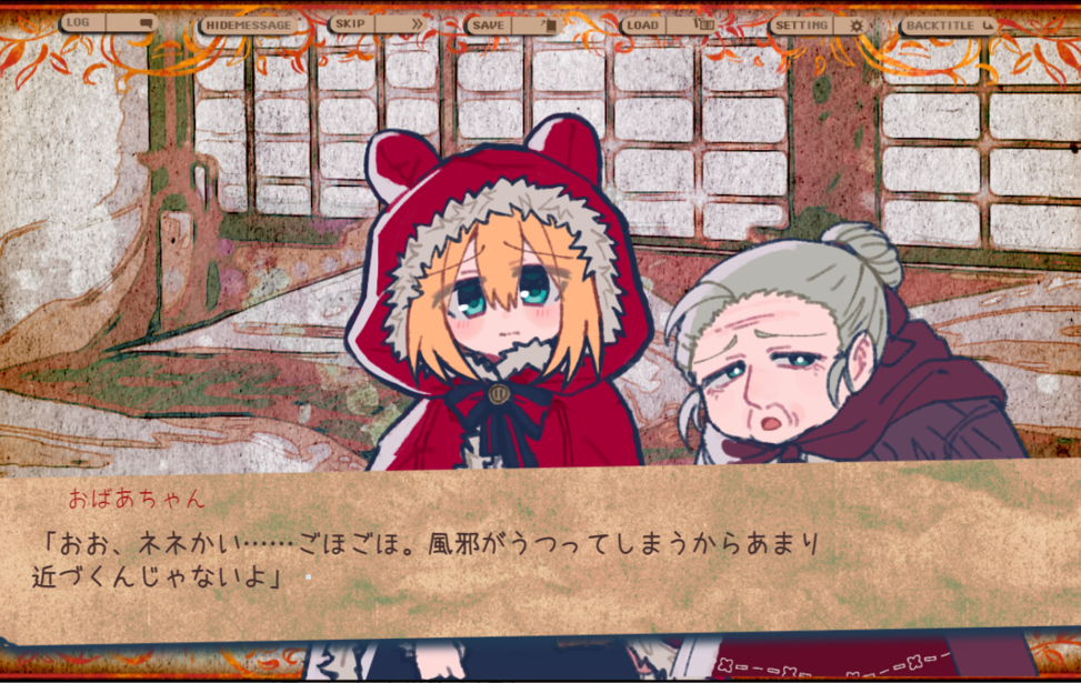 おばあちゃんに会う為、今日も赤い頭巾を被り、狼のいる森へと「勝手に」出かけるのでした。