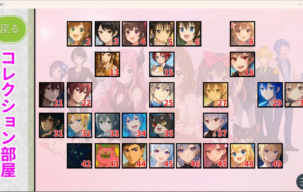 「コレクション部屋」でカードイラスト、プロフィール、個別シナリオが見れます。