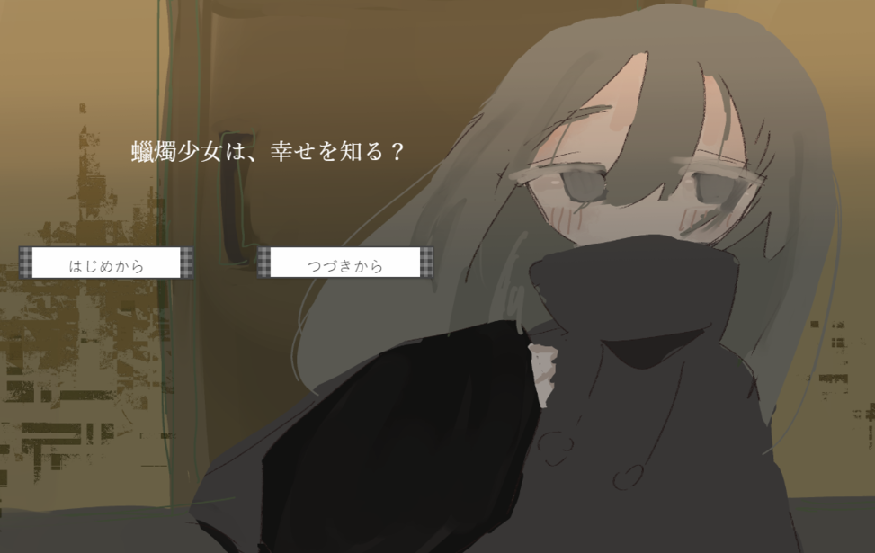 蝋燭少女は、幸せを知る? web Language English中文(简体)中文(繁體)한국어РусскийDeutschFrançaisEspañolPortuguês日本語 プレイ時間:15分 評価 3 流れるように、ぼんやり生きてきた少女が、 消えそうな自分を抱えたまま、小さな旅に出て幸せと呼ばれるものに触れるお話です。 すべて表示折りたたむ ゲーム実況NG ノベルゲーム 短編 コインで作品を応援する ブラウザでプレイゲームをプレイする windowsPC(Windows)版をDL starempty評価 star star star star star heartempty追加 twitter共有 コメント 応援コメント・ファンアートを気軽に投稿しよう! 投稿するには、ノベルゲームコレクションへの参加が必要です。 ノベルゲームコレクションへ参加する もっと見る