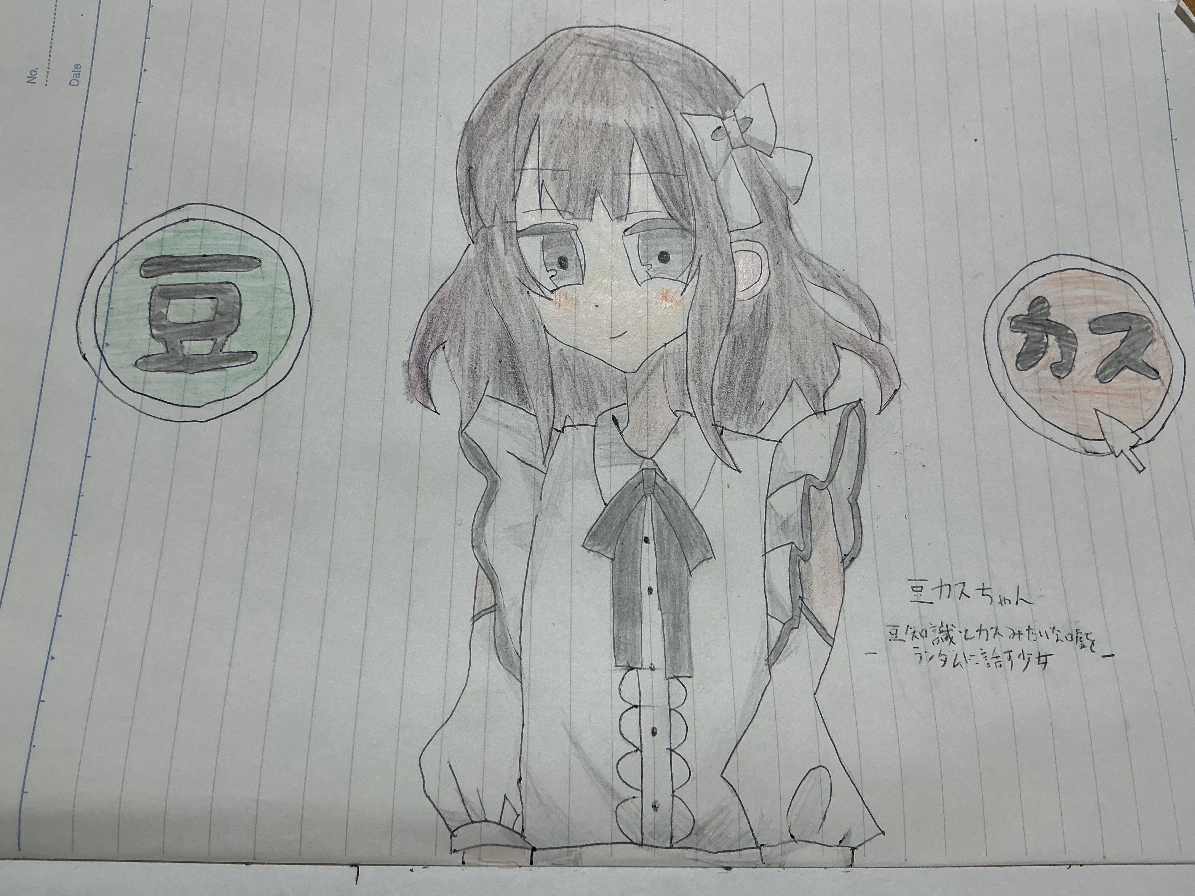 豆カスちゃん -豆知識とカスみたいな嘘をランダムに語る少女-ずっと楽しんでプレイさせていただきました。 豆知識と嘘の巧妙さとどうでもよさが絶妙で、常に面白い時間でした。 友人に布教しプレイを見るときも、いい反応をしてくれて、布教してよかったと言える作品です。 豆知識の本当か嘘かを判定する、ゲームに慣れていないような人でも手軽にプレイできるようなゲームシステムが特に素晴らしいと感じた一作です。是非様々な人にプレイしていただきたいと思いコメントを記します。 そして、慣れない私が手書きのファンアートも投稿させていただきます。 素敵な作品、ありがとうございました。 -